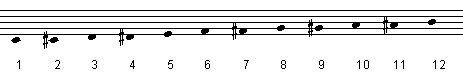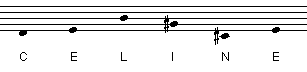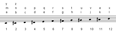 Composition prénomdans le prolongement de "avec les 12 notes chromatiques et un dé..." 2 avril 2009 (réalisation avec élève de 10 ans, 2ème année de clarinette) Sur la "gamme chromatique numérotée", distribuer les lettres de l'alphabet
